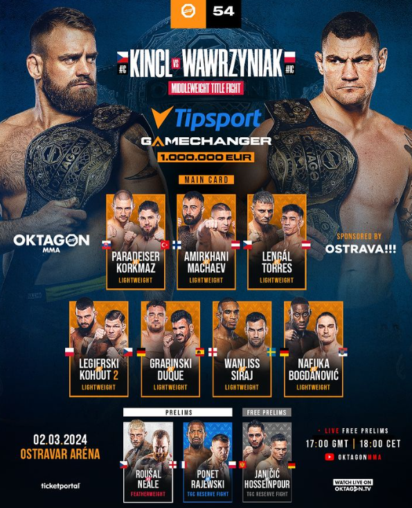 Oktagon 54, ktorý sa uskutoční už tento víkend v Ostrave sľubuje poriadnu show okrem toho, že turnaj v Ostrave uvidíme tento rok poslednýkrát, tak na tomto mieste odštartuje aj druhá séria Tipsport Gamechanger tentokrát v ľahkej váhe. Dočkáme sa aj ďalšej titulovej obhajoby šampióna strednej váhy Patrika Kincla, poďme sa teda pozrieť nato, čo nás čaká tento víkend.
